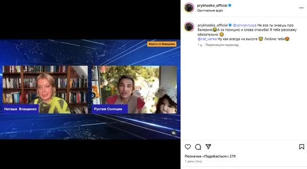 Приходько опублікувала фрагмент інтерв’ю журналістки Наталії Влащенко з російським шоуменом Рустамом Солнцевим, який у розмові згадав співачку в позитивному контексті. У відповідь Приходько подякувала йому – російською мовою.