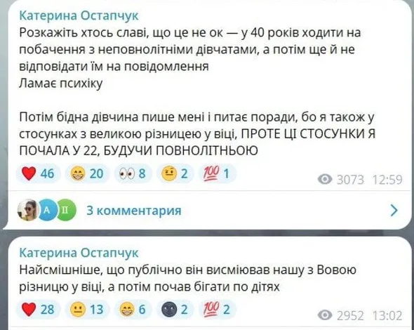 Також дружина Остапчука критикувала Дьоміна за побачення з неповнолітніми. Жінка стверджувала, що їй писала дівчина, питаючи пораду, оскільки Слава не виходив на зв'язок. Але шоумен заперечує ці заяви.