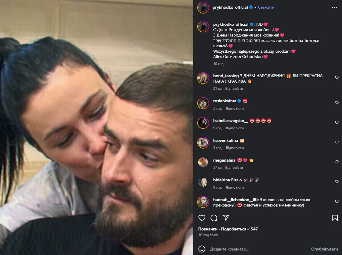 Фани відреагували на публікацію десятками теплих коментарів, відзначивши щирість і ніжність пари. Для багатьох прихильників це стало несподіванкою, адже Приходько зазвичай ділиться у соцмережах переважно творчими моментами та сімейними кадрами з дітьми.