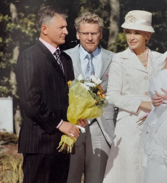 На знімку Боклан у темному костюмі з квітами в руках, а Калантаї вдягнений у сірий. Сумська приміряла світлий наряд.