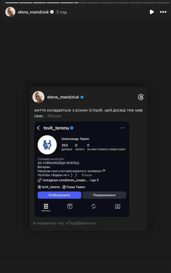 Блогерка Олена Мандзюк повідомила, що більше не спілкується з ветераном війни та героєм «Холостяка-13» Олександром Тереном, заблокувавши його в Instagram.