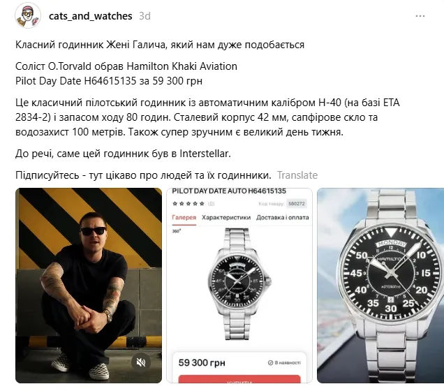 «Соліст O.Torvald обрав Hamilton Khaki Aviation Pilot Day Date H64615135 за 59 300 грн. Це класичний пілотський годинник із автоматичним калібром H-40 (на базі ETA 2834-2) і запасом ходу 80 годин. Сталевий корпус 42 мм, сапфірове скло та водозахист 100 метрів. Також супер зручним є великий день тижня. До речі, саме цей годинник був в Interstellar».