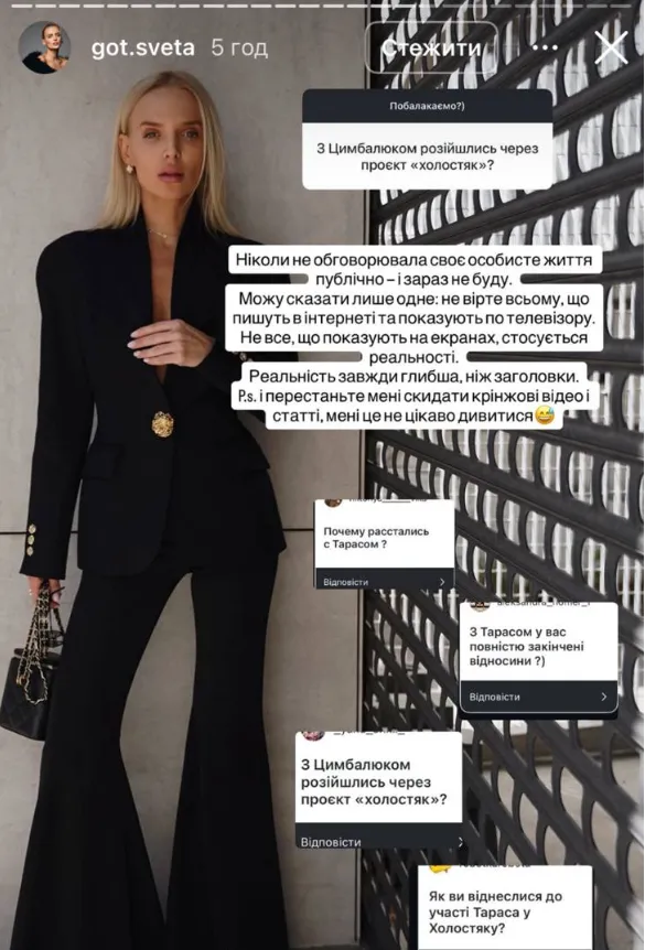 Колишня кохана Тараса Цимбалюка, Світлана Готочкіна, вперше відреагувала на чутки про участь актора у шоу «Холостяк». Дизайнерка в Instagram відповіла підписникам, чи стало шоу причиною їхнього розставання. Жінка запевнила, що не варто вірити всьому, що показують по ТБ.