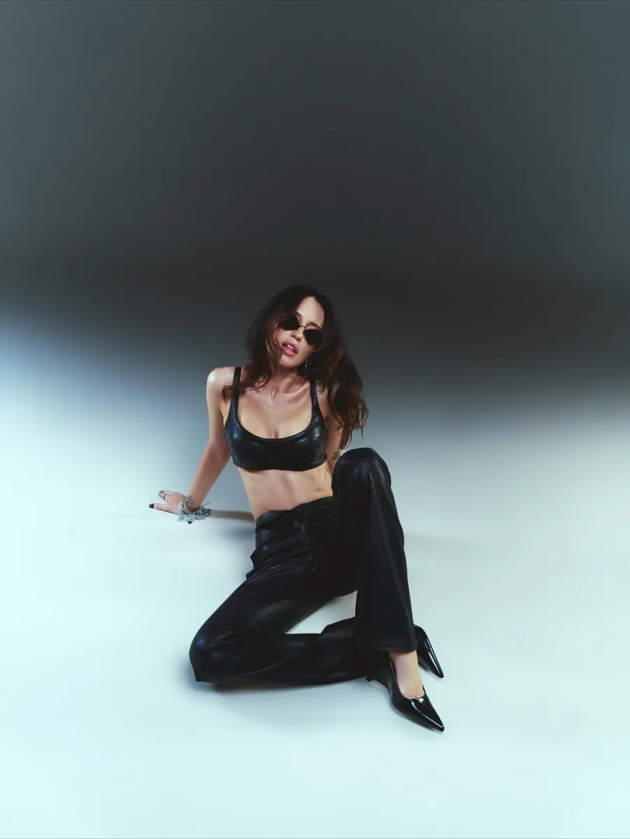 Артистка постала в стильному та зухвалому шкіряному образі — у чорних шкіряних штанах і короткому топі, який підкреслив її струнку фігуру.