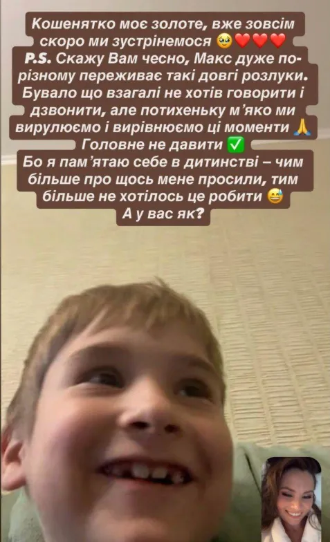 «Скажу Вам чесно, Макс дуже по-різному переживає такі довгі розлуки. Бувало, що взагалі не хотів говорити й дзвонити, але потихеньку м’яко ми вирулюємо та вирівнюємо ці моменти. Головне – не тиснути. Я пам’ятаю себе в дитинстві – чим більше мене про щось просили, тим більше не хотілось це робити», – поділилася Хижняк.