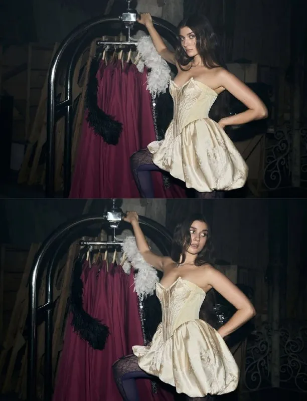 Jerry Heil знову вразила шанувальників своїм стильним образом. Цього разу співачка з’явилася у розкішній сукні молочного кольору зі спущеними плечима, корсетом, кріноліном та фіолетовими стрічками «медуза».