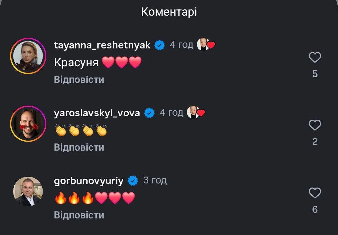 Співачка Tayanna написала «Красуня ❤️❤️❤️», шеф‑кухар Володимир Ярославський залишив серію оплесків 👏, а чоловік телеведучої Юрій Горбунов відреагував емоційними смайлами 🔥❤️.
