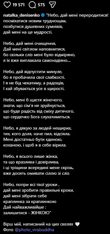Разом із фотосесією Денисенко поділилася власним віршем, який написала просто під час зйомки.