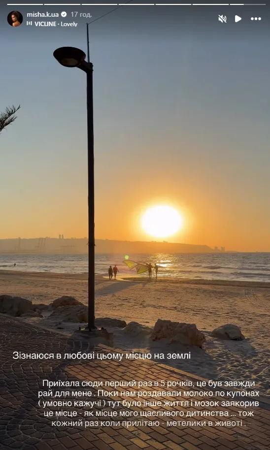 «Зізнаюся в любові цьому місцю на землі. Приїхала сюди перший раз у 5 рочків, це був завжди рай для мене. Поки нам роздавали молоко по купонах (умовно кажучи) – тут було інше життя, і мозок заякорив це місце як місце мого щасливого дитинства... тож кожного разу, коли прилітаю - метелики в животі», - написала акторка у своїй історії.