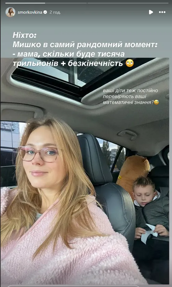 «Ніхто: Мишко в самий рандомний момент: Мама, скільки буде тисяча трильйонів + безкінечність?» – написала актриса у своєму пості, поділившись весело. і наївною допитливістю сина.