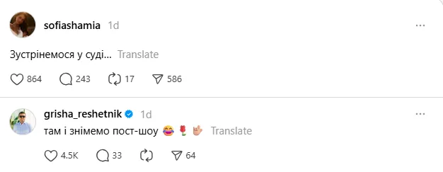 Причиною обурення Шамії став монтаж шоу: на її думку, у кадр вставили забагато моментів, коли вона називала себе «Міс», а також показали її як «малу наївну дівчинку». У коментарях до свого допису на Threads Решетник відреагував на погрози судом і пожартував: