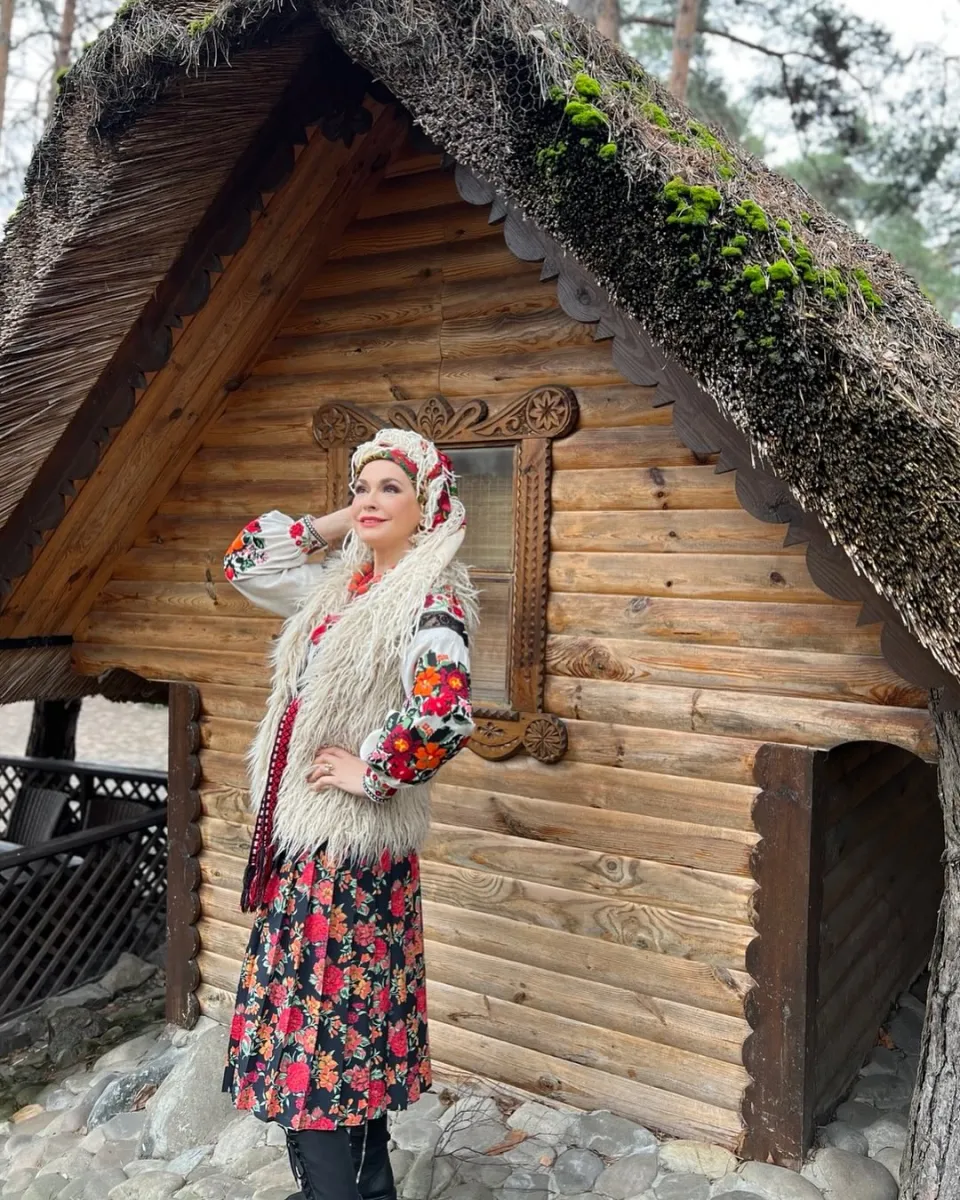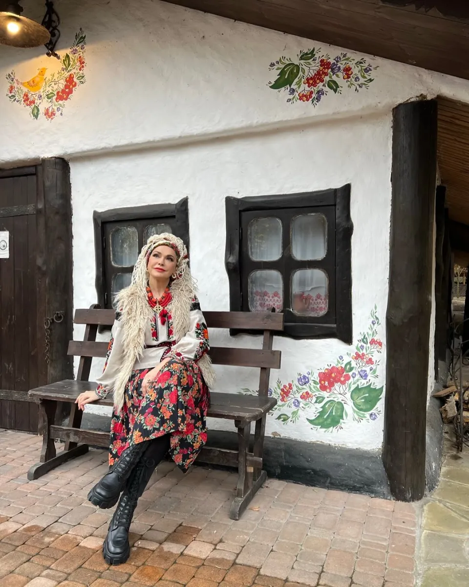 На фото вона позує біля старовинної хати з розписаними віконницями, у вбранні з яскравими етнічними мотивами.