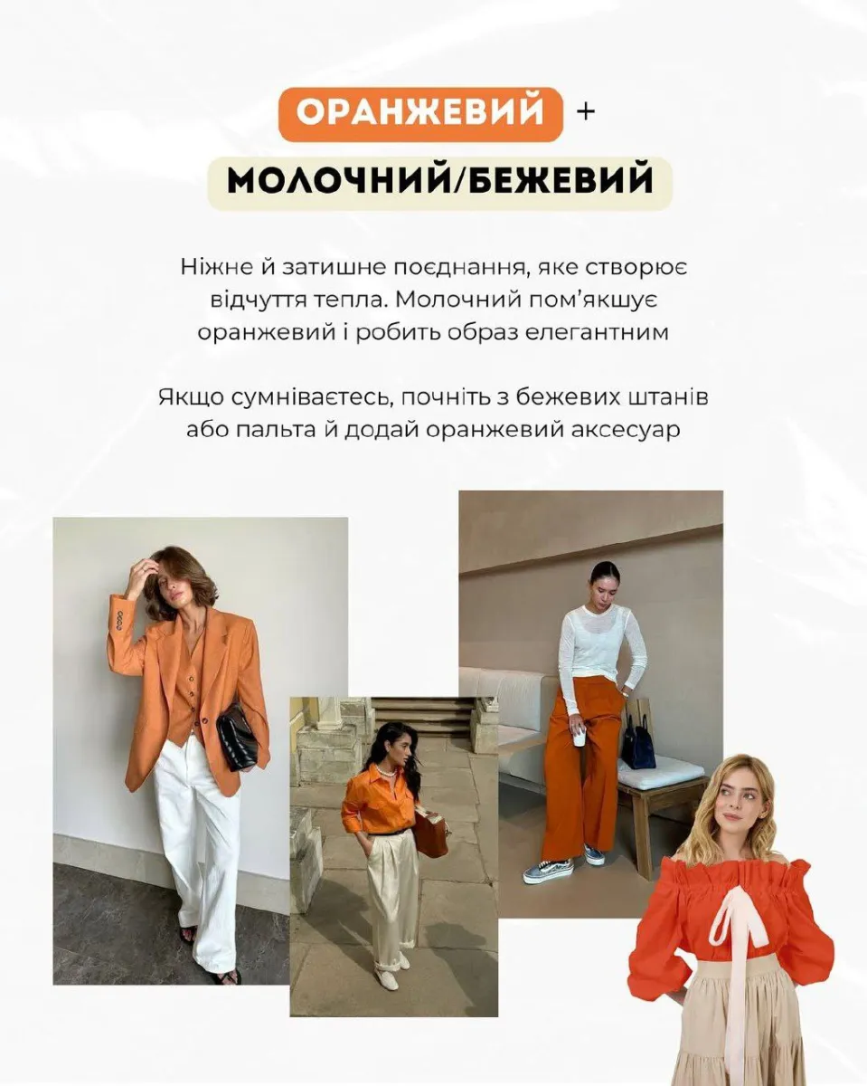 Першим дизайнер запропонував поєднання помаранчевого з молочним чи бежевим. На його думку, такий дует пом’якшує образ і додає йому елегантності. Андре радить почати з базових бежевих штанів або пальта, доповнивши їх помаранчевим аксесуаром.