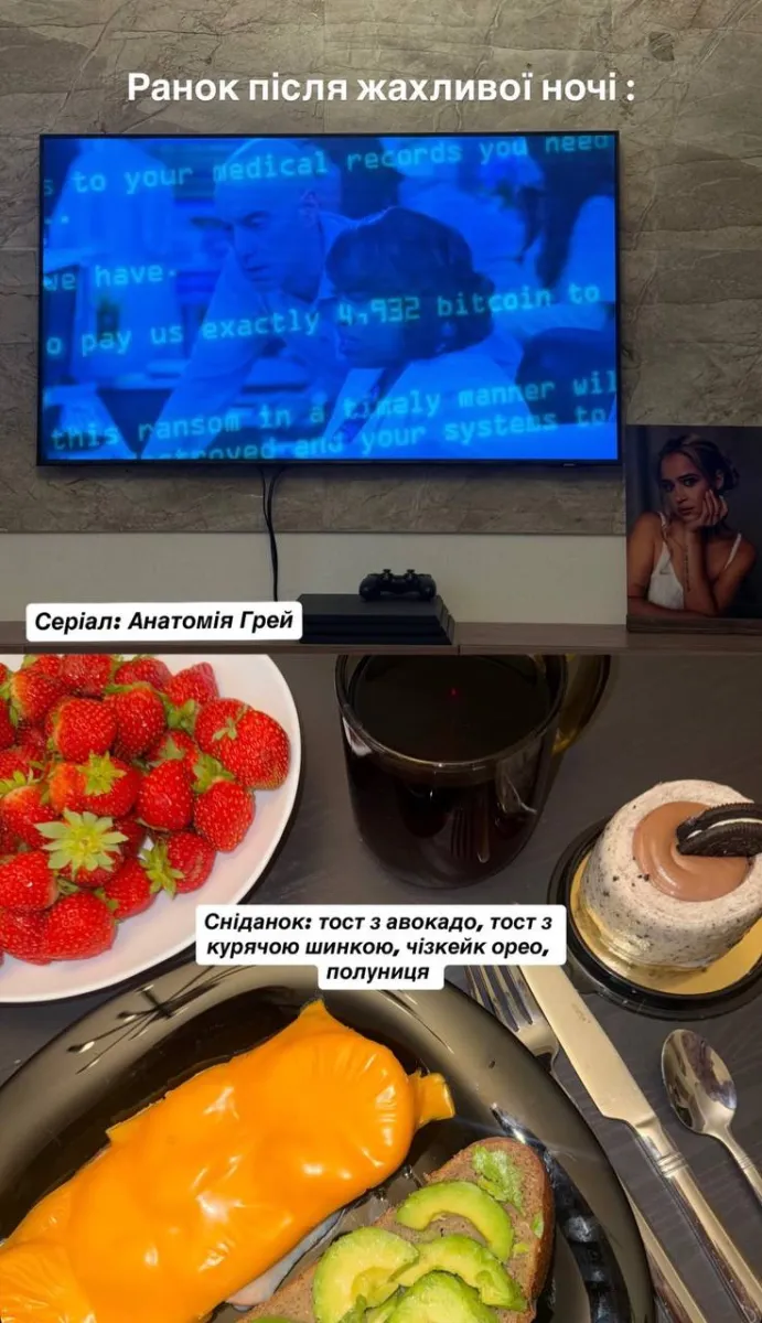 Колишня учасниця популярного шоу «Холостяк» Інна Бєлєнь поділилася в Instagram сторіс атмосферним кадром свого ранку. Після, за її словами, «жахливої ночі» дівчина вирішила розпочати день із перегляду серіалу «Анатомія Грей» та смачного сніданку.