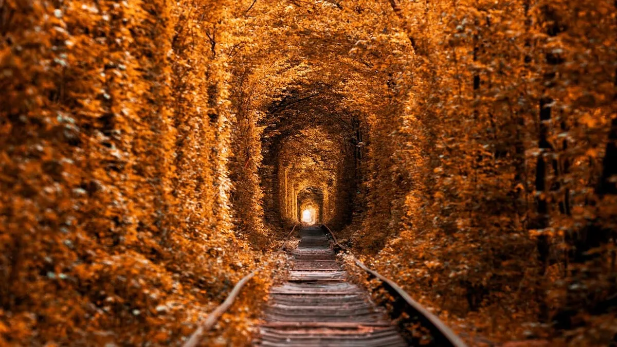 Ще один маршрут — «Тунель кохання» у Клевані. Це один із найромантичніших куточків країни, де поєднуються густі дерева й мальовничі залізничні колії, що створюють ефект природного зеленого тунелю, який восени вкривається золотом.