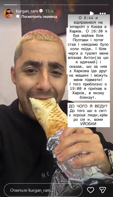 Учасник гурту «Курган & Agregat» Раміл Насіров розповів про несподівану історію, яка трапилася під час його подорожі з Києва до Харкова. Про це він написав на своїй сторінці в Instagram.