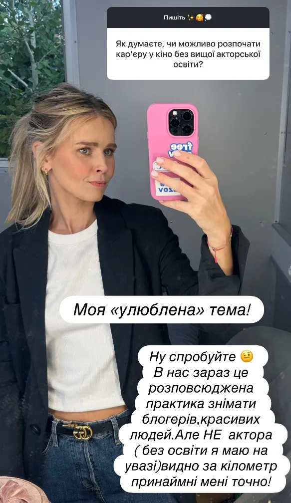 Про це артистка розповіла під час спілкування зі своїми підписниками в Instagram, відповівши на питання, чи можна почати кар’єру у кіно, не маючи вищої акторської освіти.