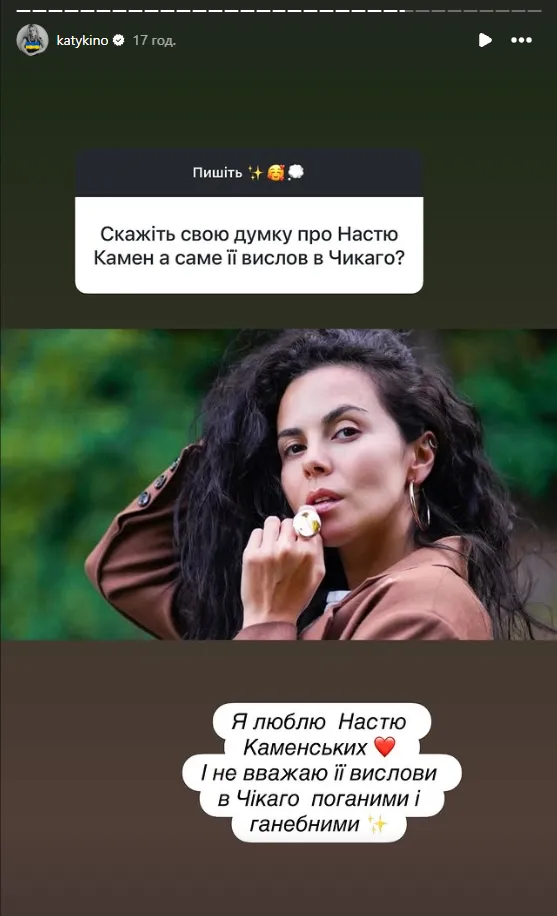 У своїх сторіс в Instagram Катерину запитали, як вона ставиться до цієї ситуації. Кузнєцова відповіла відверто, що вона не засуджує Каменських. Акторка любить співачку і не бачить у її словах нічого ганебного.