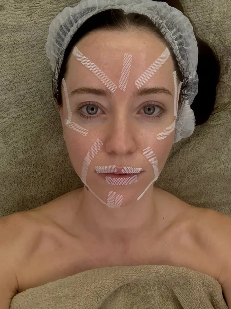 На своїй сторінці в Instagram артистка показала обличчя з тейпами під час косметологічної процедури та пожартувала: