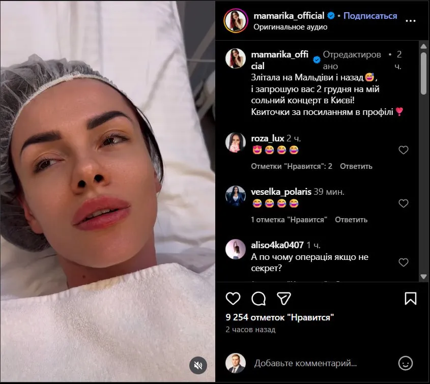 У відео вона також пожартувала про лікаря-анестезіолога та додала, що «літала на Мальдіви», коли була під наркозом. На що її чоловік, не стримуючи сміх, відповів: «Так, на Мальдіви». Потім MamaRika знову повернулася до теми концерту і запропонувала за посиланням придбати білети на грудневий захід.