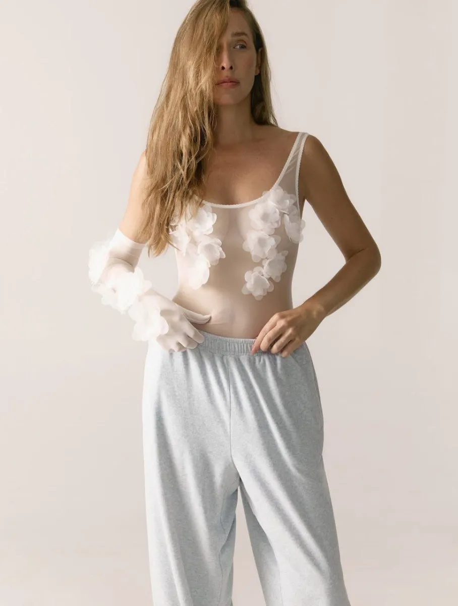 Катя показала себе у напівпрозорому боді, прикрашеному квітами, яке додало образу ніжності та пікантності. Елегантності образу прибавила рукавичка з вишитими на ній квітами, а несподіваним елементом стали спортивні штани, що зробило лук одночасно романтичним і спортивним.