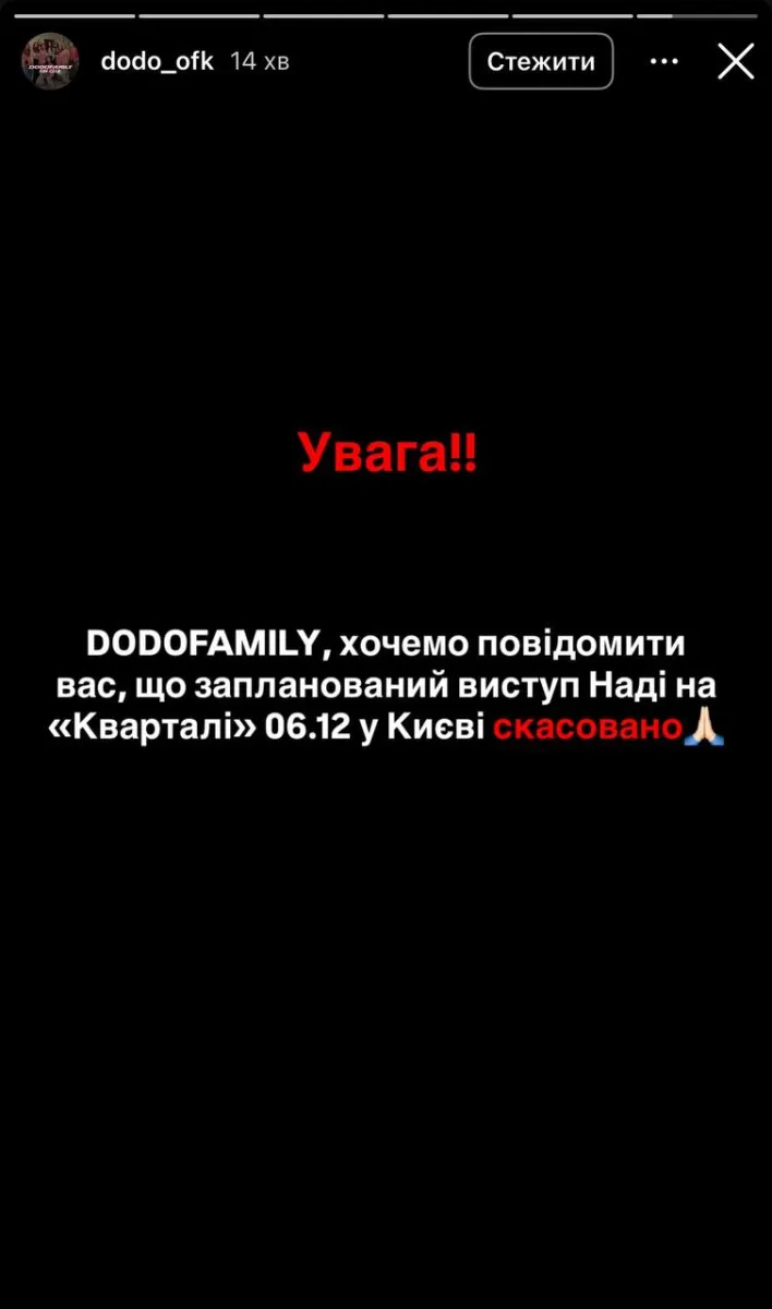 На фоні відмов колег по шоубізнесу Надя Дорофеева повдомила, що її участь у концерті «Кварталу» також скасовано. Інформація про це зʼявилася на офіційні сторінці фанклубу співачки у Instagram.