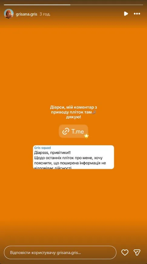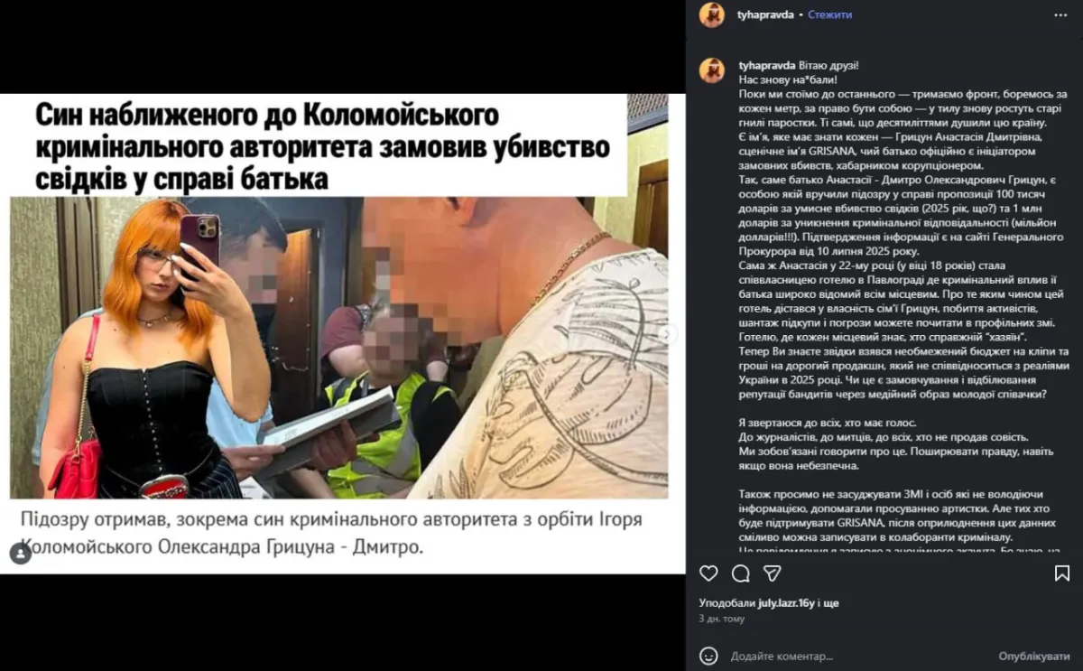 У повідомленні йшлося про батька артистки, Дмитра Грицуна, якого пов’язали з корупційними схемами та замовними злочинами. Додатково було згадано, що сама GRISANA у молодому віці нібито стала співвласницею готелю в Павлограді – деталь, яка викликала особливий резонанс.