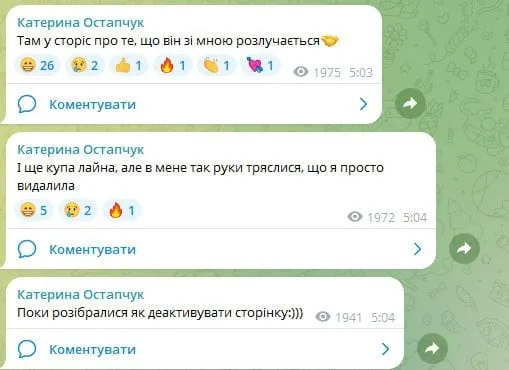 За словами Катерини, вночі вона прокинулася, щоб погодувати дитину, і саме тоді помітила підозрілу активність в Instagram чоловіка. Дружина підкреслила, що Остапчук спав, тому всі дії в акаунті здійснював не він.