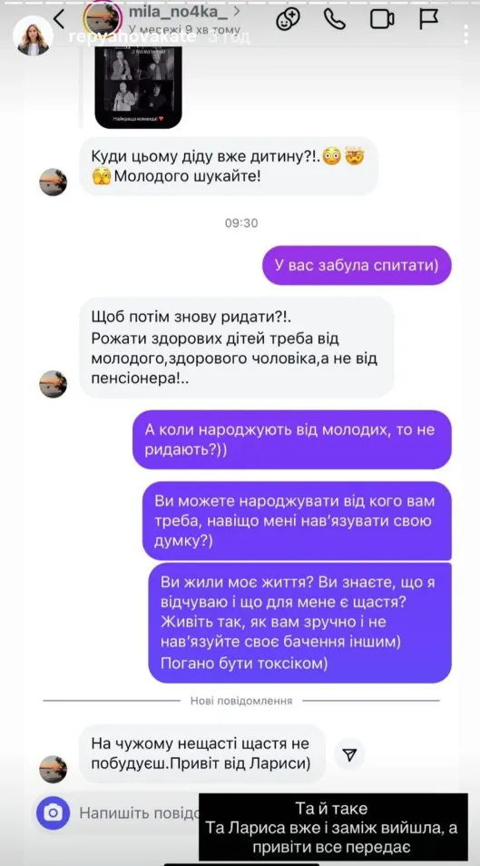 У своїх Stories Катерина продемонструвала повідомлення від однієї підписниці, яка різко відреагувала на бажання Репяхової народити ще одну дитину.