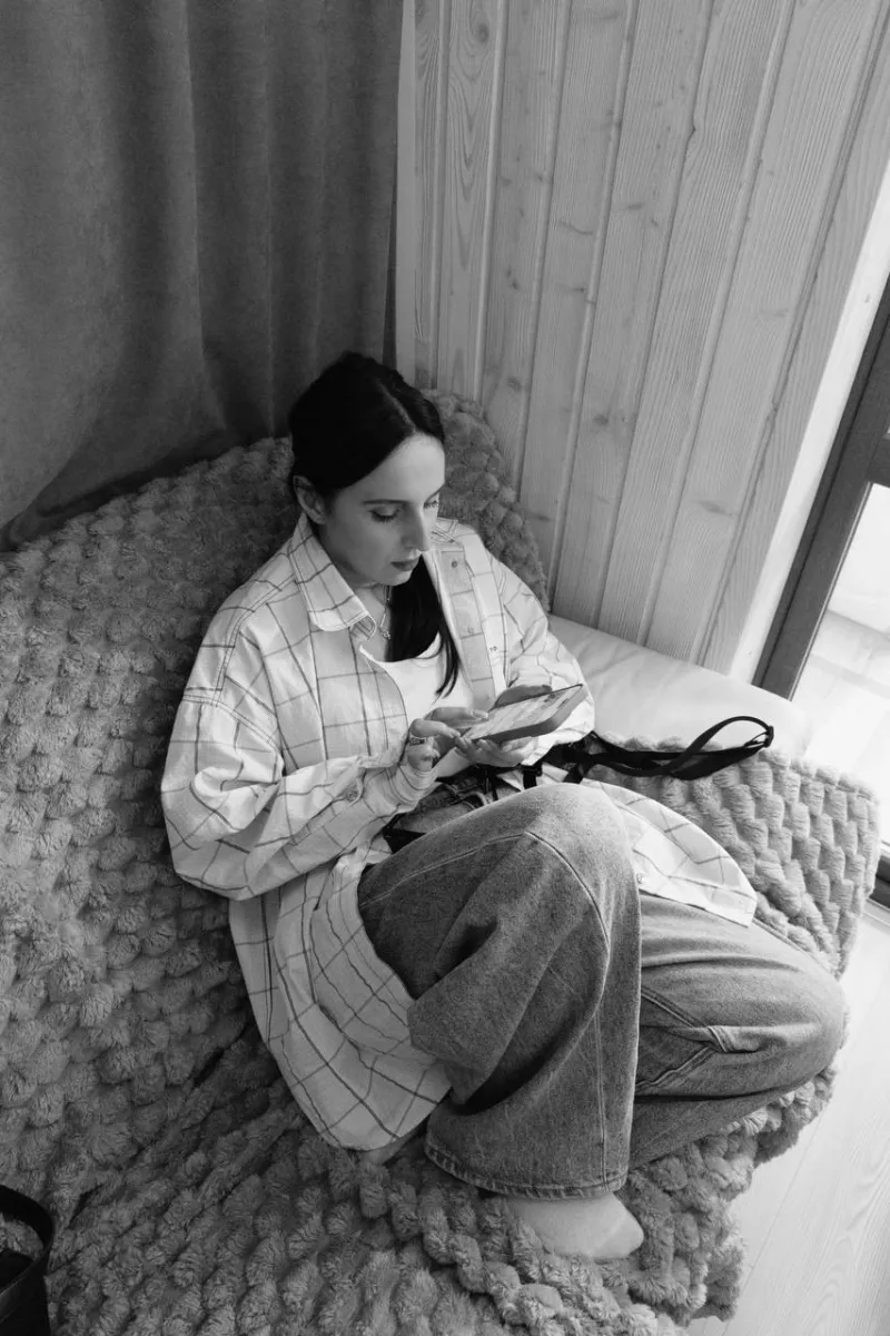 На іншому фото, виконавиця відпочиває на диванчику, дивлячись щось у смартфоні. Ймовірно, вона дає собі перепочити після інтенсивної роботи над піснями.