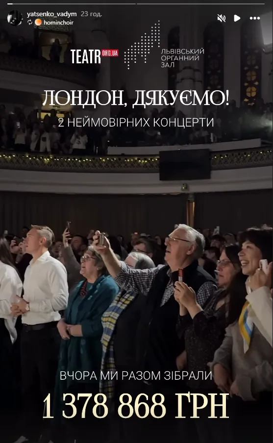 На своїй сторінці в Instagram художній керівник колективу Вадим Яценко повідомив, що їх виступи у столиці Великої Британії має благодійну мету. За два благодійних концерти вдалося зібрати 1 378 868 гривень.