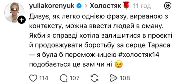 Юлія Коренюк у шостому випуску «Холостяка» 14-го сезону з Тарасом Цимбалюком відмовилася продовжувати участь у романтичному шоу. Вже після виходу епізоду вона звернулася у threads до підписників із гучною заявою, пояснивши, що її слова вирвали з контексту, а вона могла б стати переможницею проєкту, якби тільки цього захотіла.