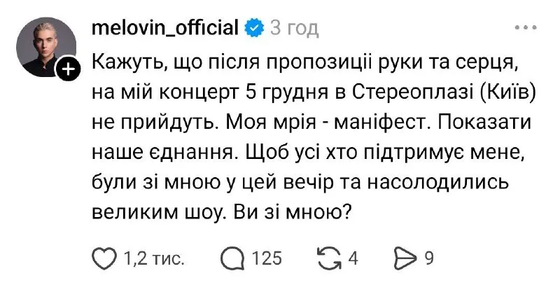 «Кажуть, що після пропозиції руки та серця, на мій концерт 5 грудня в Стереоплазі (Київ) не прийдуть. Моя мрія – маніфест. Показати наше єднання. Щоб усі, хто підтримує мене, були зі мною у цей вечір та насолодилися великим шоу. Ви зі мною?», – написав Бочаров.
