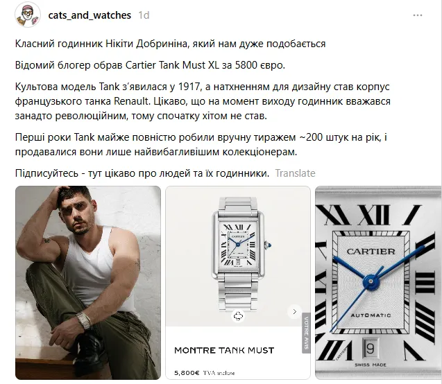 «Класний годинник Нікіти Добриніна, який нам дуже подобається. Відомий блогер обрав Cartier Tank Must XL за 5800 євро. Культова модель Tank з’явилася у 1917, а натхненням для дизайну став корпус французького танка Renault».