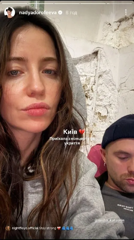 На нічний жах відреагувала й українська співачка Надя Дорофєєва. За її словами, одразу після концерту вона разом із чоловіком Мішою Кацуріним пішла в укриття. Зірка показала фото зі словами: