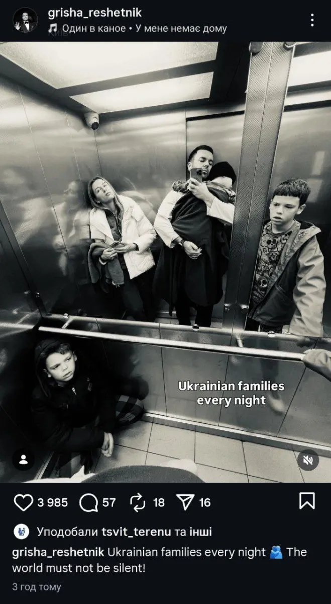 Дружина українського телеведучого Григорія Решетніка, Христина засвітилася на сторінці коханого, з дітьми у ліфті, якими вони, ймовірно, спускалися в укриття під час обстрілу. На знімку видно переляканих дітей і втомлену родину.