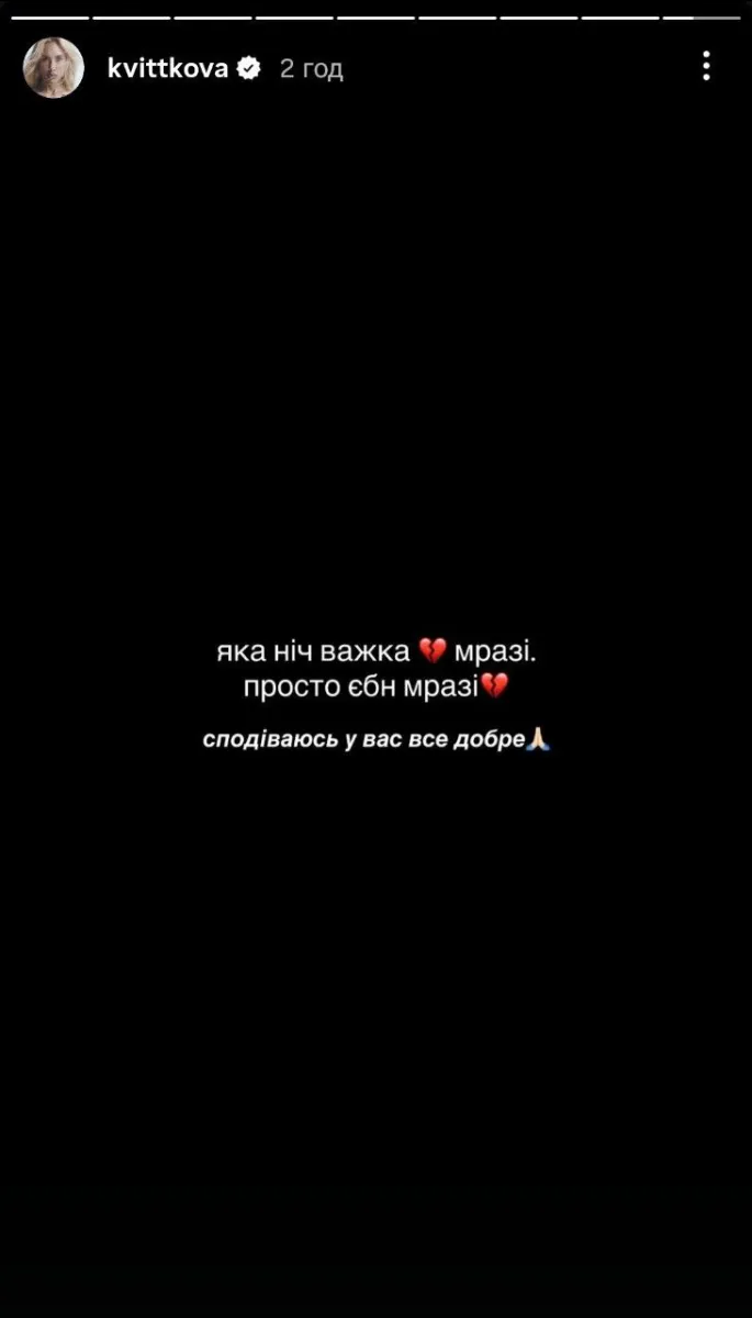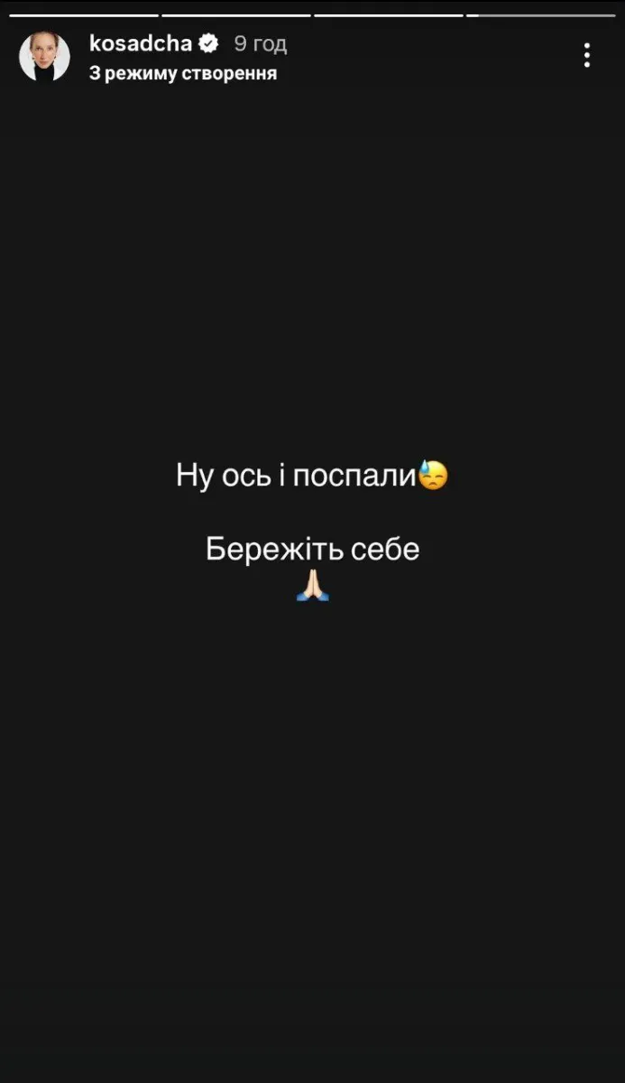 Колишня ведуча «Світського життя» Катерина Осадча теж відреагувала на атаку: розповіла, що поспати цієї ночі не вдалося, і закликала всіх берегти себе.