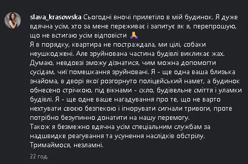 Один із снарядів поцілив у багатоквартирний будинок, де мешкає акторка Слава Красовська. Її квартира залишилася неушкодженою, проте частина споруди зазнала серйозних руйнувань.