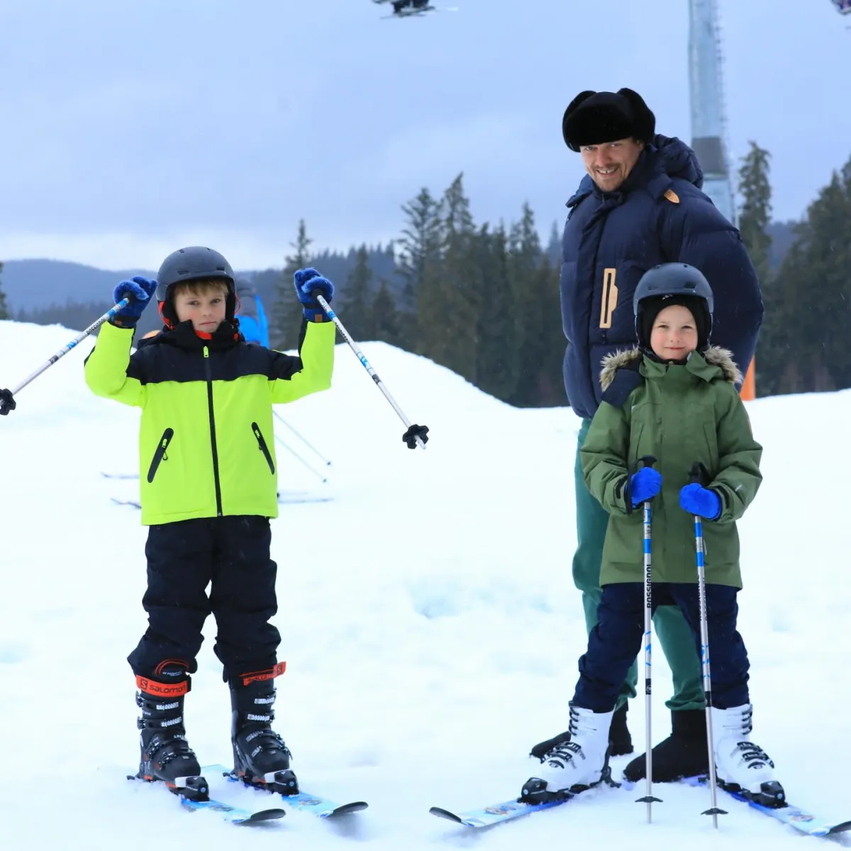 На тлі засніженого схилу – чоловік, Олександр Усик, у темній куртці та хутряній шапці, двоє дітей у яскравому спорядженні, а позаду – гірськолижний витяг і зимовий ліс.