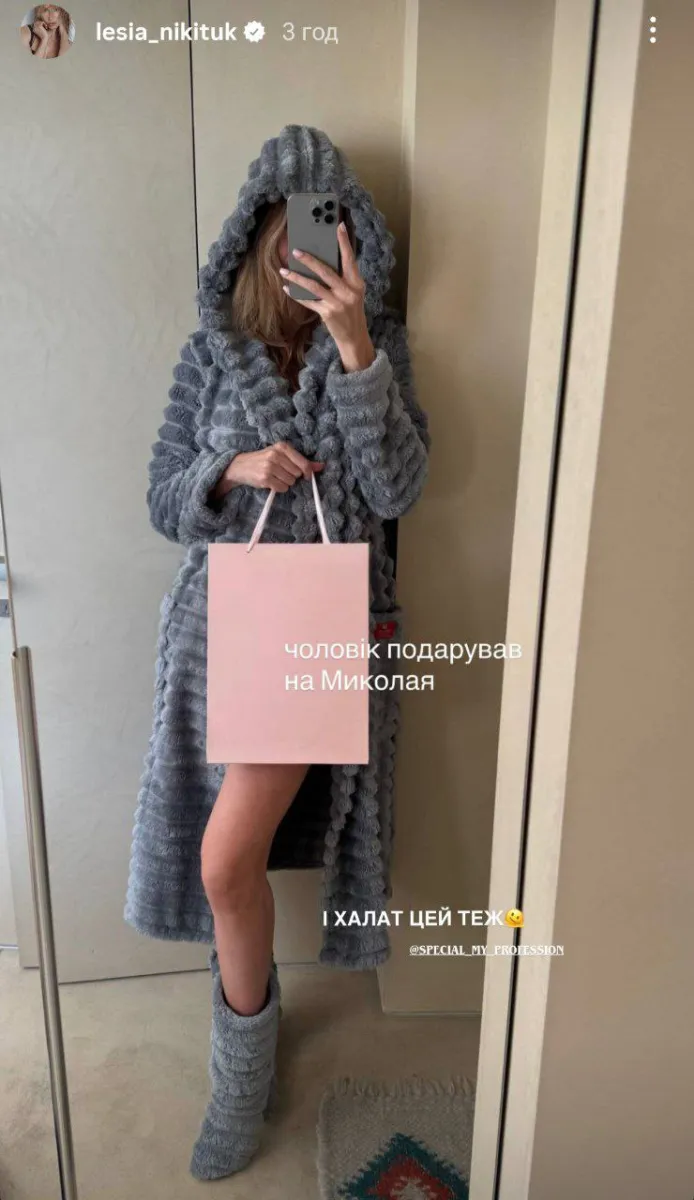 Телеведуча Леся Нікітюк поділилася у Instagram святковими подарунками, які вона отримала від чоловіка на День Святого Миколая. Зірка показала рожевий подарунковий пакетик і продемонструвала пухнастий халат «Шиншила», який також став частиною сюрпризу.