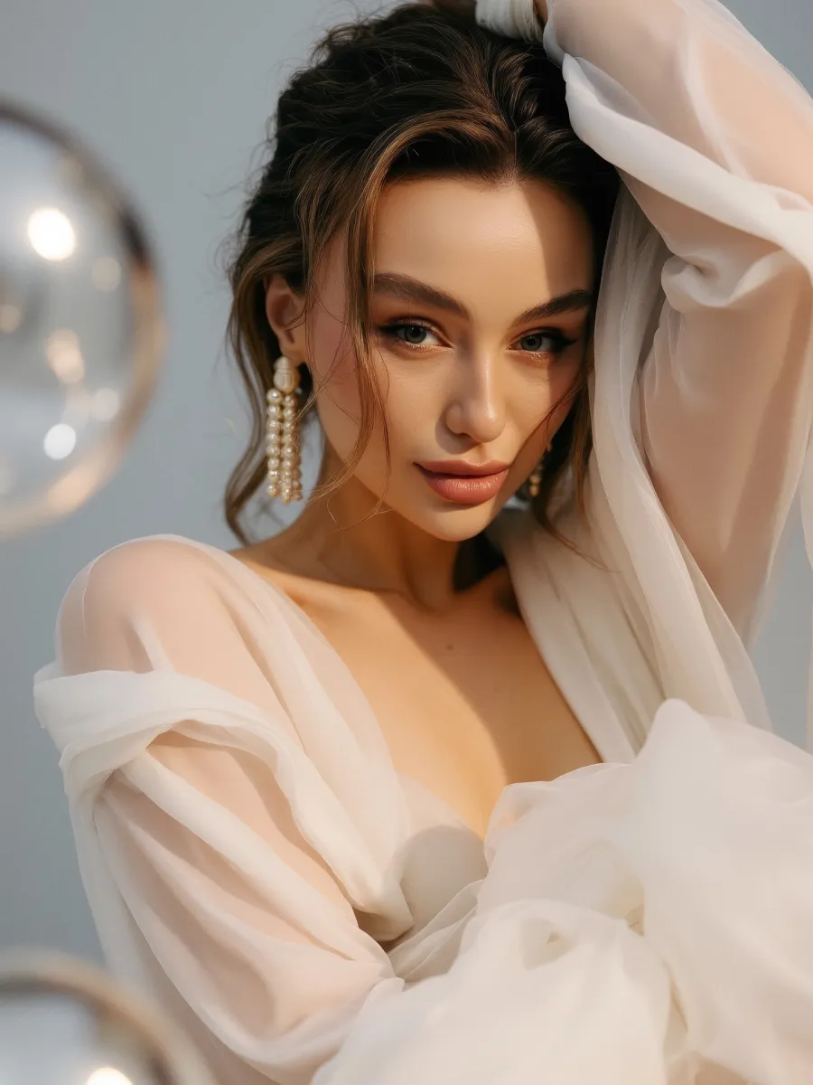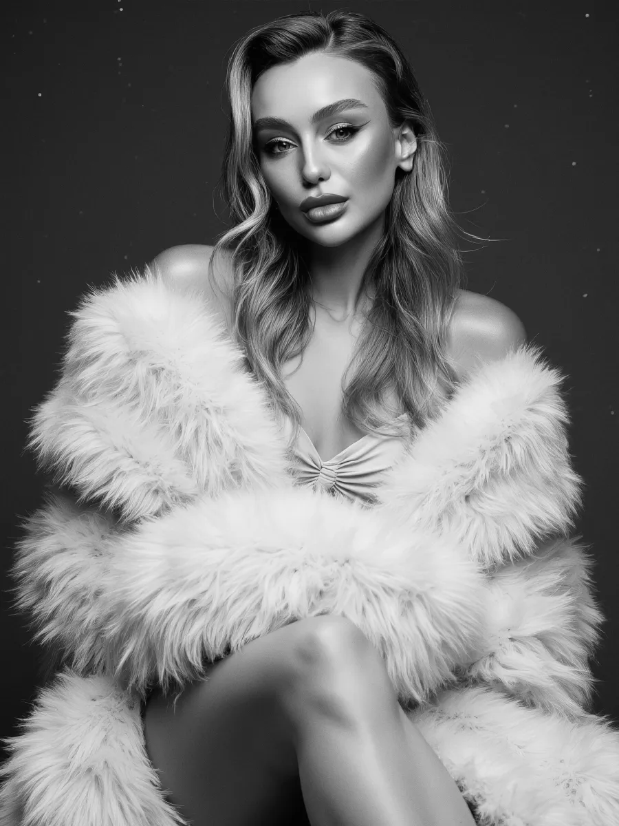 На фото вона постає у різних образах з пухнастими накидками, акцентним макіяжем та м’яким студійним світлом.