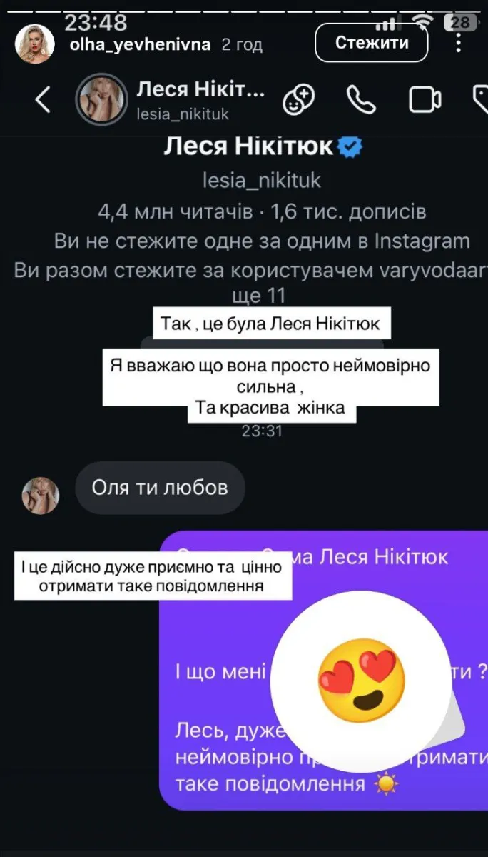 «Так, це була Леся Нікітюк. Я вважаю, що вона просто неймовірно сильна та красива жінка. І дійсно дуже приємно та цінно отримати таке повідомлення», – додала вона.