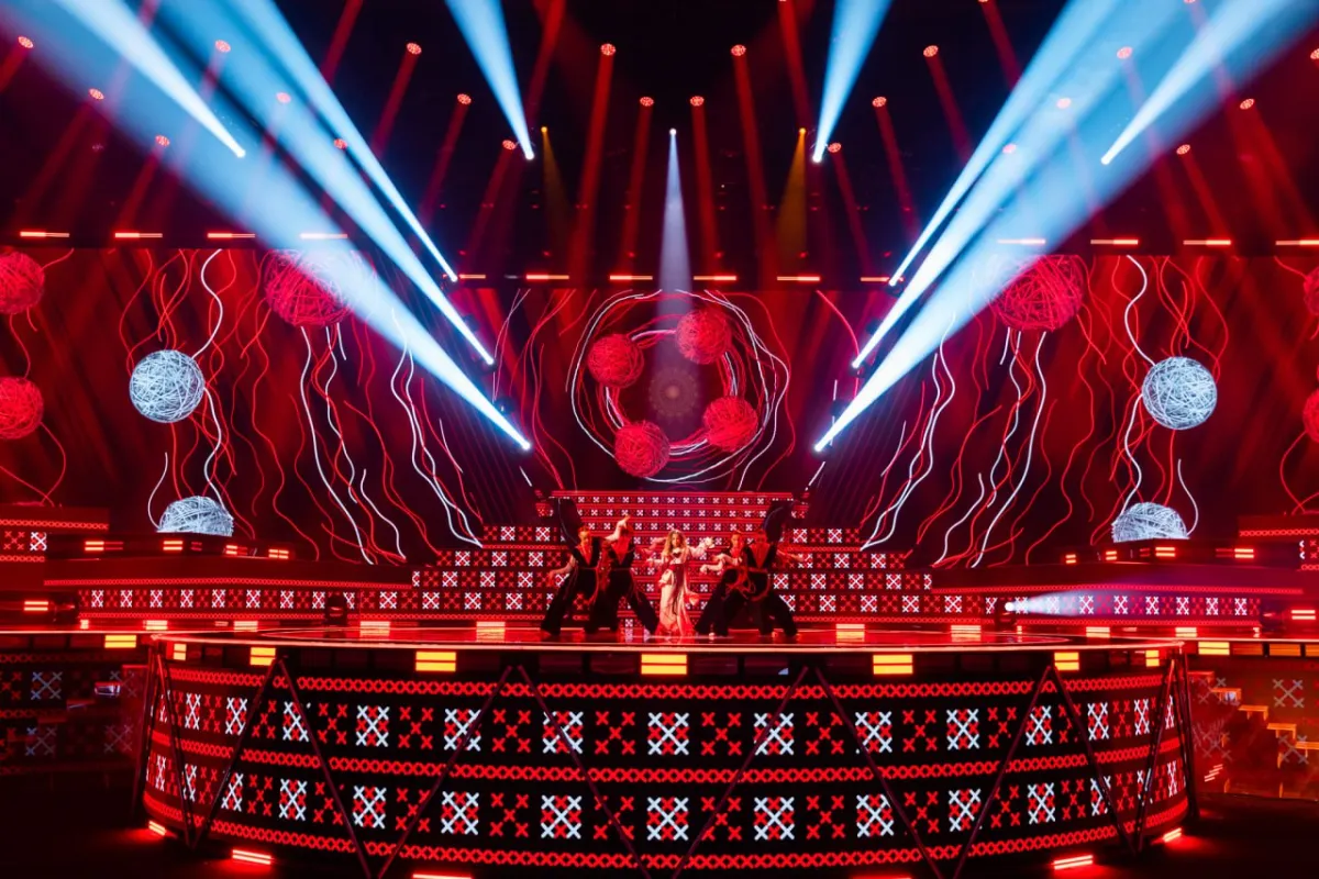 І з фото видно – це ще не все, чим номер зможе здивувати глядачів. Організатори вдало попрацювали зі світлом і додали контрасту темному простору та яскраво-червоним світловим елементам, що підсилюють сенс пісні.