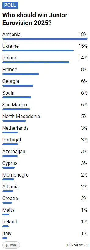 Першою у рейтингу тримається Вірменія, яку представляє Albert з піснею «Brave Heart» – 18%. На третьому місці Польща (14%), четверте – Франція (8%), п’яте – Грузія (6%).