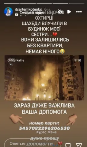 «Сьогодні вночі в Охтирці шахеди влучили в будинок моєї сестри... Вони залишилися без квартири, немає нічого». Після цього артист попросив українців про фінансову допомогу, аби підтримати родину у важкий період.