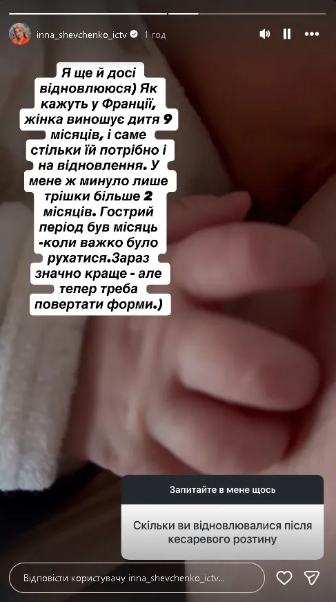 За словами ведучої, французькі лікарі наголошують: жінка відновлюється стільки ж часу, скільки виношує дитину. Інна зізнається, що така перспектива її не лякає, адже перший місяць був найважчим – саме тоді будь-який рух відчувався, як окрема подія.