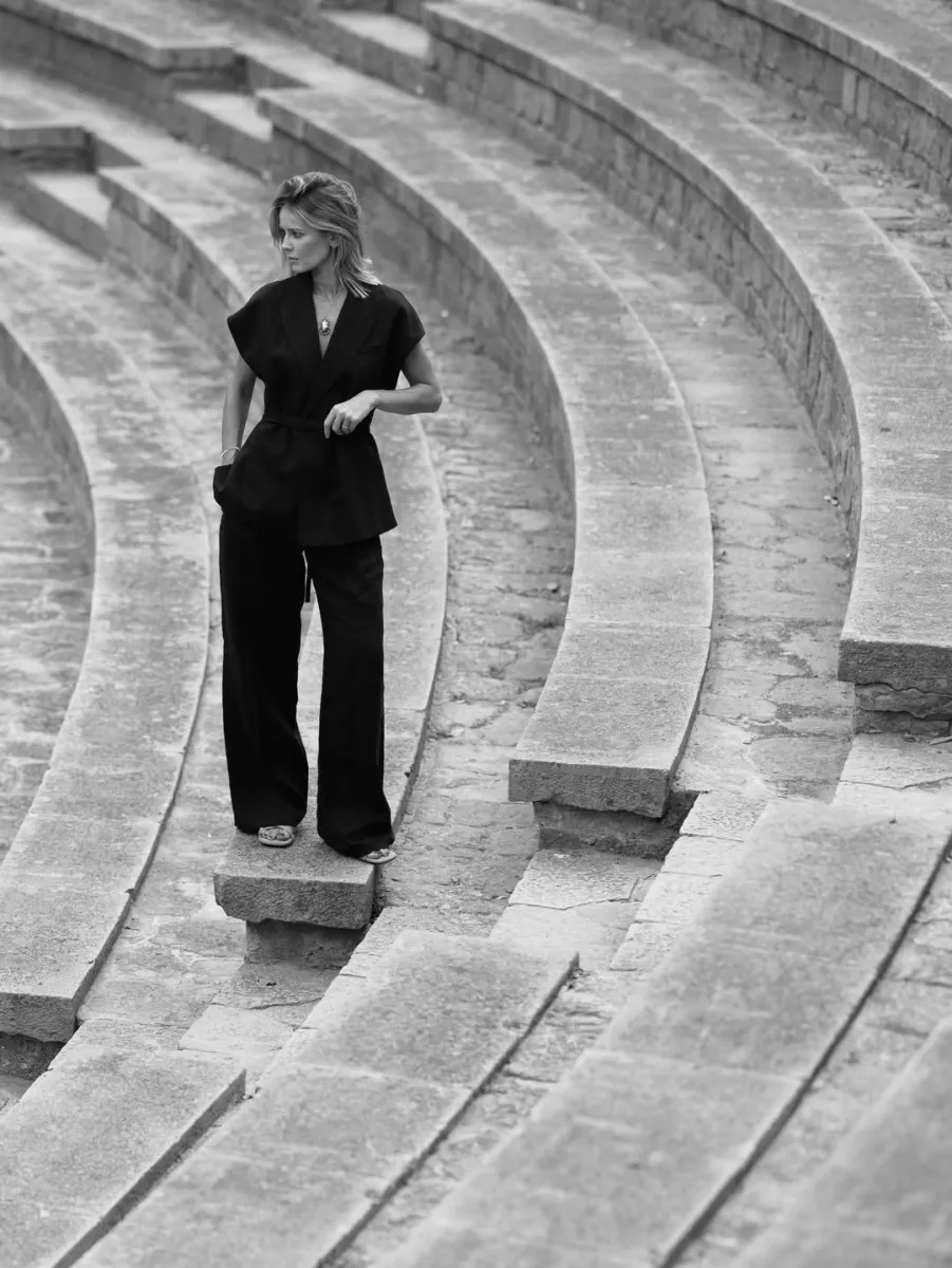На іншому знімку Катерина виглядає ще більш загадково – вона задумливо стоїть на кам’яних сходах, а чорно-білий формат робить фото ще атмосфернішим.