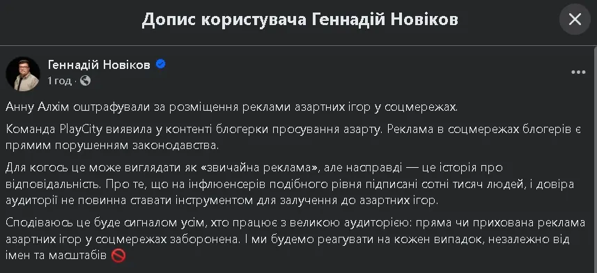 Команда PlayCity повідомила про виявлення у контенті блогерки Анни Алхім матеріалів, які вони класифікували як рекламу азартних ігор, - написав у себе в FB Голова Державного агентства з контролю грального та лотерейного бізнесу в Україні PlayCity Геннадій Новіков.