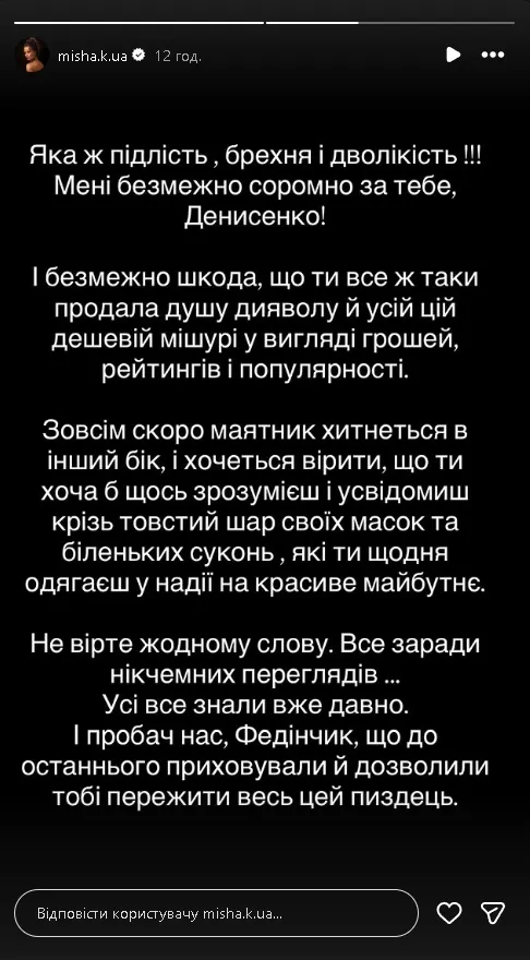 У своєму дописі Мішина прямо звернулася до Денисенко, критикуючи її за «продаж душі за гроші, рейтинги та популярність» і зазначила, що «всі давно знали правду». Акторка також наголосила, що «зовсім скоро маятник хитнеться в інший бік» і закликала усвідомити наслідки власних дій.