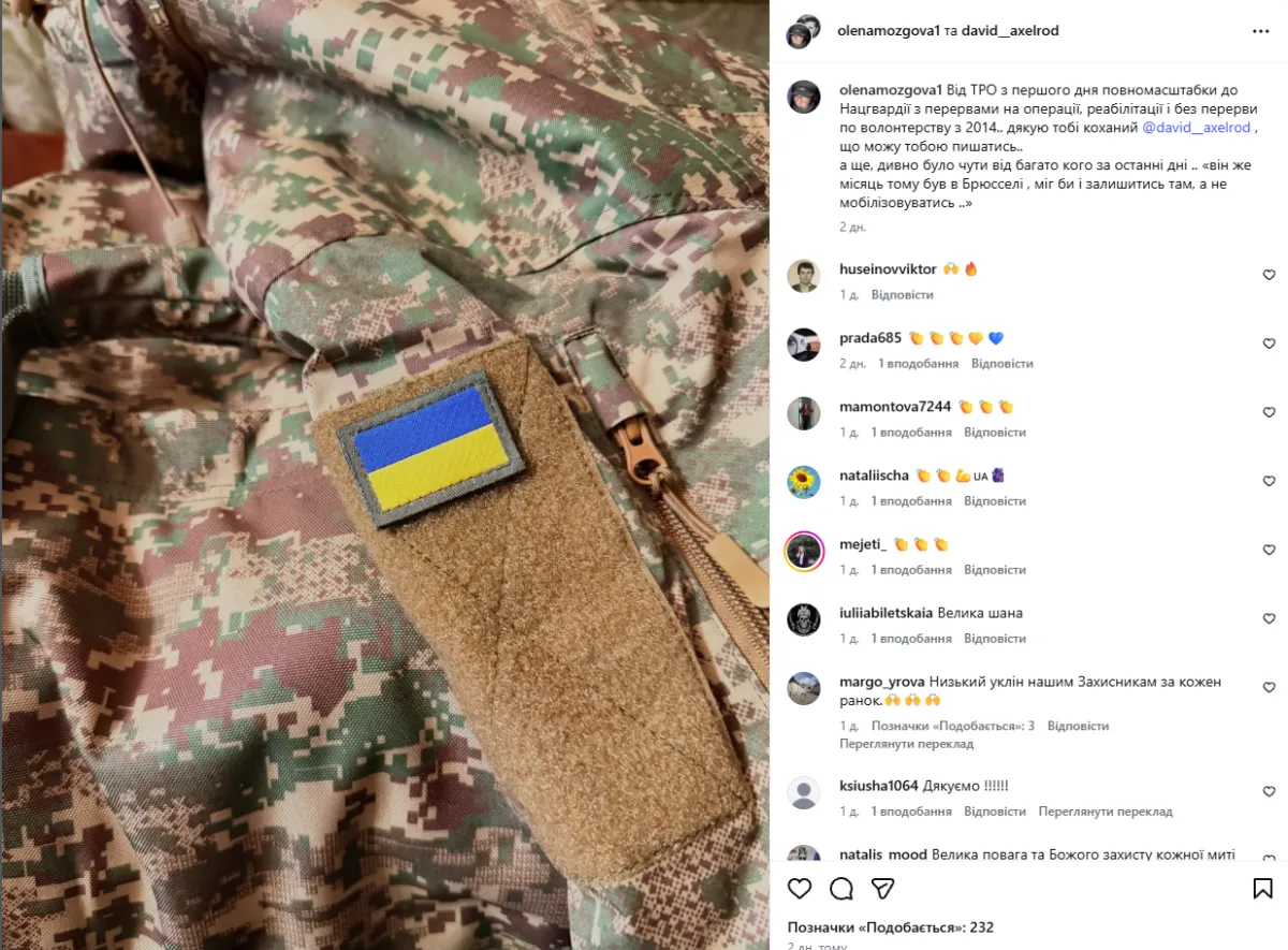 «У ТрО від першого дня повномасштабного вторгнення до Нацгвардії з перервами на операції, реабілітації і без перерви у волонтерстві від 2014. Дякую тобі, коханий Девід Аксельрод, що можу тобою пишатись. А ще дивно було чути від багато кого за останні дні: «Він же місяць тому був у Брюсселі, міг би і залишитись там, а не мобілізовуватись», – написала Олена.